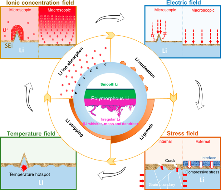 Our group studies the connection between multiphysical fields (e.g., ionic concentration field, electric field, stress field, and temperature field) and polymorphous Li metal evolution during the entire cycle life, as well as exploring efficient approaches to enhance the reversibility, stability, and safety performance of metal batteries through the multiphysical field regulation strategies.