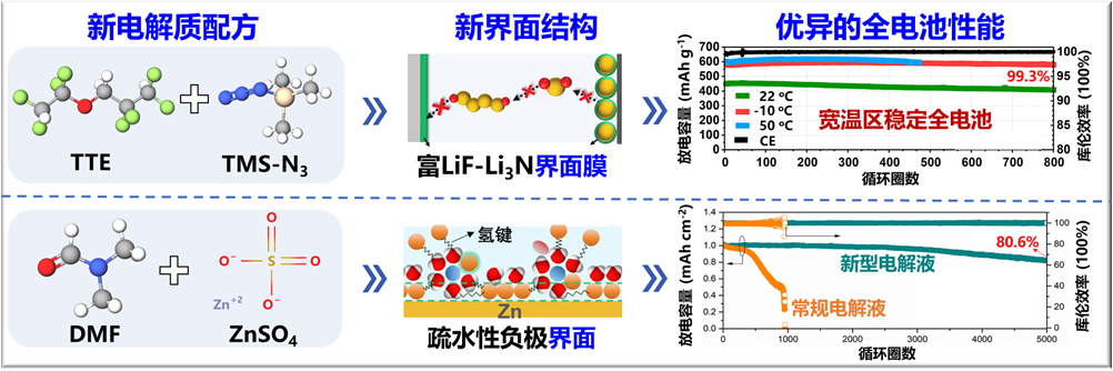 Our group is dedicated to the designs of multifunctional electrolytes and interface/interphase for metal batteries in both liquid systems and solid-state systems, aiming to enhance the comprehensive performance including wide-temperature operation ability, long-cycle stability, fast rechargeability, safety without dendrite issue, etc.